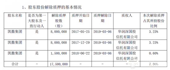 今日下午,凯撒(中国)文化股份有限公司发布了关于控股股东部分股份解除质押的公告。
