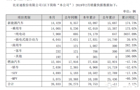 公告显示,2019年2月,比亚迪汽车总销量为2.68万辆,本年累计销量为7.08万辆,累计同比增加3.12%。其中,新能源汽车2月销量为1.44万辆,累计同比增长174.73%。虽然新能源销售业绩提升较快,但比亚迪的燃油汽车销量仍不乐观,总体下滑47.74%。具体而言,轿车、SUV和MPV分别同比下降52.67%、17.13%和60.26%。