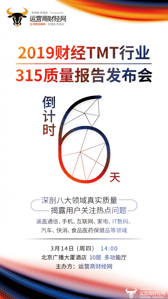 据悉,运营商财经网的315质量发布会将会在3月14日举行,而之前,运营商财经网已经举办了两届315质量发布会,今年是第三届。以往在大会上发布的质量报告涉及的领域包括通信、互联网、家电、IT数码。但是,在2019年1月底,运营商财经网全面转型,向房地产、汽车、食品、医药、消费品、金融、证券等行业拓展,因此,在此次发布会上也会发布相关的质量报告。