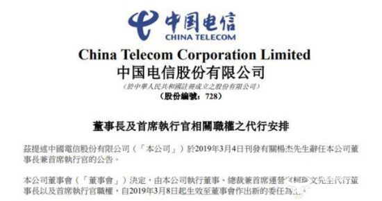 运营商财经网获悉,3月8日,中国电信发布公告:由于杨杰辞任公司董事长兼首席执行官公司董事会决定,由公司执行董事、总裁兼首席运营官柯瑞文代行董事长以及首席执行官职权。自2019年3月8日起生效至董事会作出新的委任为止。