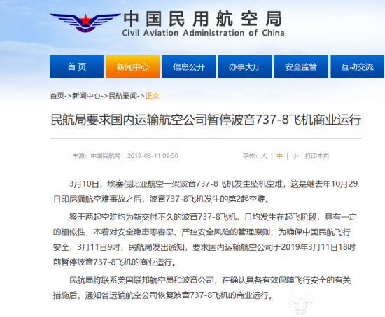 中国民航局部表示,鉴于两起空难均为新交付不久的波音737-8飞机,且均发生在起飞阶段,具有一定的相似性,本着对安全隐患零容忍、严控安全风险的管理原则,为确保中国民航飞行安全,3月11日9时,民航局发出通知,要求国内运输航空公司于2019年3月11日18时前暂停波音737-8飞机的商业运行。