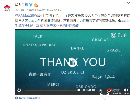 今日上午,华为手机官方微博发布消息称:华为Mate20系列上市四个半月,全球发货量破1000万台!感谢全球消费者的支持与认可,华为手机将继续创新,不断前行,为你带来更好的智慧体验。
