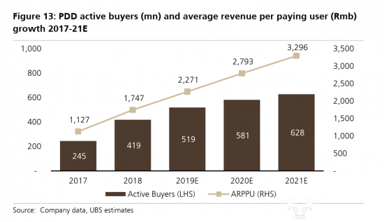 ▲瑞银预测:2021年,拼多多年活跃买家将达6.28亿,用户平均年消费达3296元。按此计算,拼多多2021年的年GMV将达2.07万亿元。