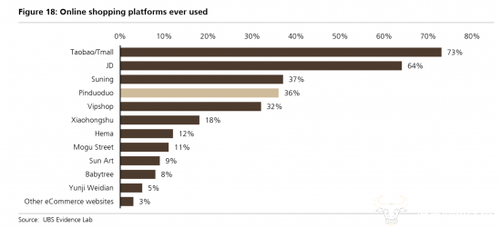 ▲瑞银调查后认为,不同于其他电商平台,拼多多在中国已经拥有极高的知名度,但仍有很多人从未尝试使用拼多多