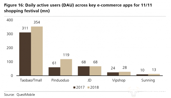 ▲2018年双十一期间,拼多多的日活用户为1.19亿,位列行业第二。瑞银预测,2019年,淘宝和拼多多的日活用户优势将愈发明显