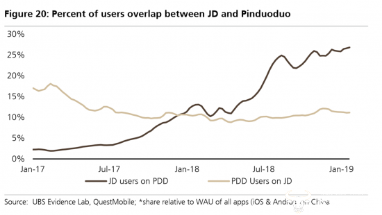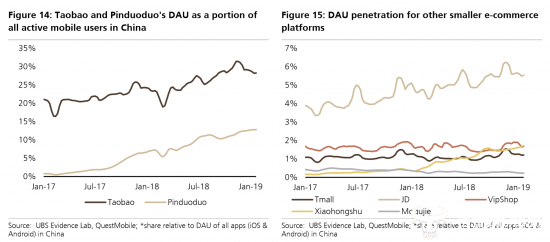 瑞银指出:截至2018年底,拼多多的年活跃用户为4.18亿,阿里为6.36亿,京东为3.05亿,按用户数计算,拼多多已经是中国第二大电商平台。