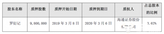 据悉,2019年3月11日,公司控股股东罗衍记就已质押给德邦证券股份有限公司的6300000股无限售流通股(占公司总股本的2.33%),办理了提前购回及解除质押手续,相关手续已办理完毕。