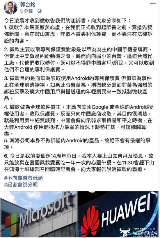 针对微软对富士康母公司鸿海提起法律诉讼一事,富士康创始人郭台铭回应称,微软的目的是向华为收取安卓的专利保护费,但怕遭到抵制,所以向“弱小”下手,是霸凌者行为。