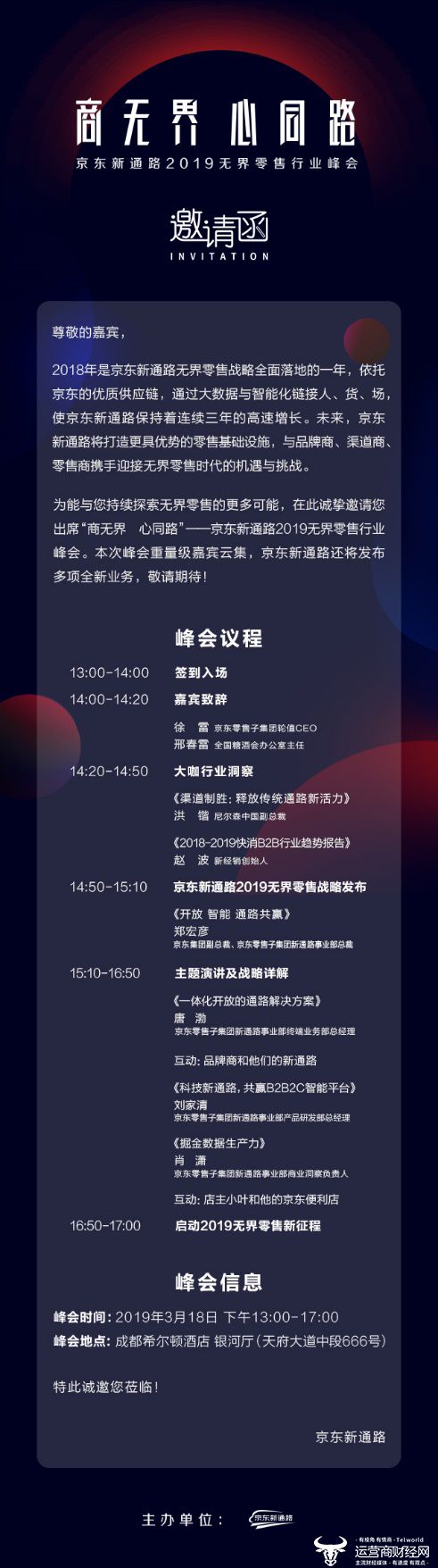 3月18日,京东新通路与新经销联合主办的“商无界 心同路”—京东新通路2019无界零售行业峰会即将在成都召开,这是京东新通路事业部正式走向前台后的首次战略发布会。