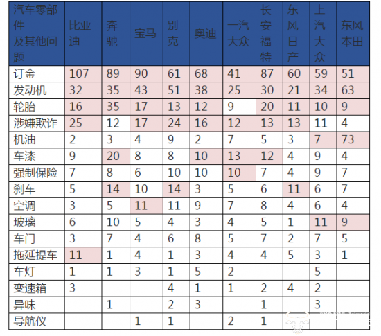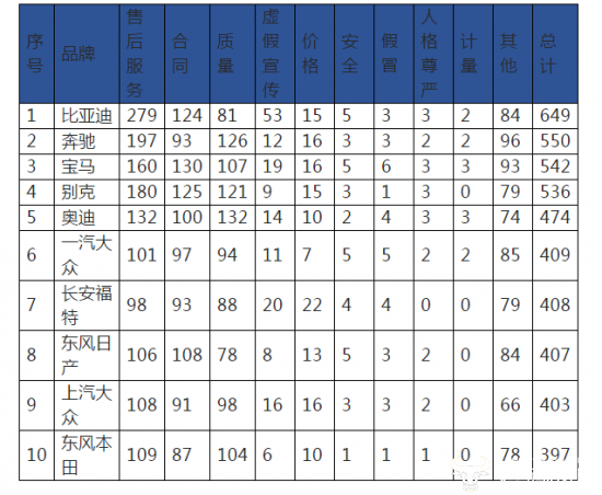 同时,从投诉涉及品牌来看,比亚迪位以649的投诉量居首位,第二位到第十位分别为奔驰、宝马、别克、奥迪、一汽大众、长安福特、东风日产、上汽大众和东风本田。