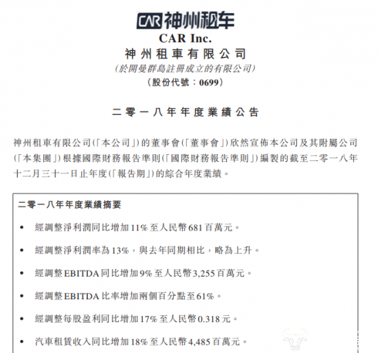 3月12日消息,神州租车发布截至二零一八年十二月三十一日的綜合年度财报。神州租车发布的财报显示,净利润为2.90亿元,同比下降67%;经调整净利润为6.81亿元,同比增加11%;2018年租赁收入总额为53.40亿元,同比增长6%。