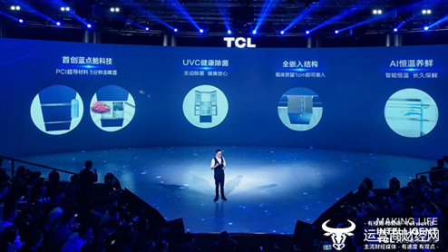 在本次发布会上,TCL 正式推出“TCL 全场景 AI”, 以及以AI×IoT”为核心的“4T”场景化产品矩阵。凭借强大智慧科技,伴随着灵动的旋律,一台轮廓闪烁着幽幽蓝光的X10冰箱自动打开,跨越山川湖海,历经四季更替,容纳鲜滋百味;一条大鱼纵身一跃,新鲜在此刻被极速留存;当科技创新与生活相融,极具科技感和艺术美学特质的X10洗衣机悄然启动,远处悬空而来代表永恒和坚定的美钻被放入,一段优美的旋律之后,是极富现代感的璀璨夺目,是一生一世闪烁的耀眼光芒,缓缓移到舞台中央。