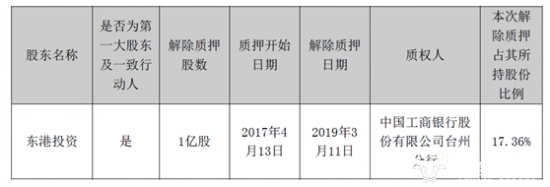 公告显示,浙江海翔药业股份有限公司于2019年3月12日接到公司控股股东浙江东港投资有限公司通知,获悉东港投资将其持有公司的部分股票办理了解除质押手续,具体情况如下:
