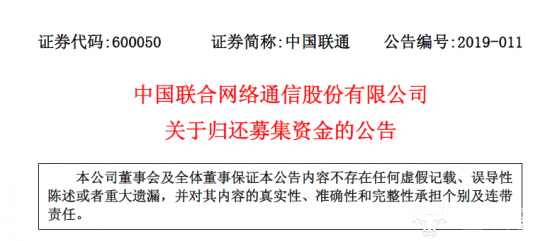 公告显示,截至2019年3月12日,中国联通已按承诺将实际用于补充流动资金的人民币249.47亿元募集资金全部归还至联通运营公司募集资金专项账户。