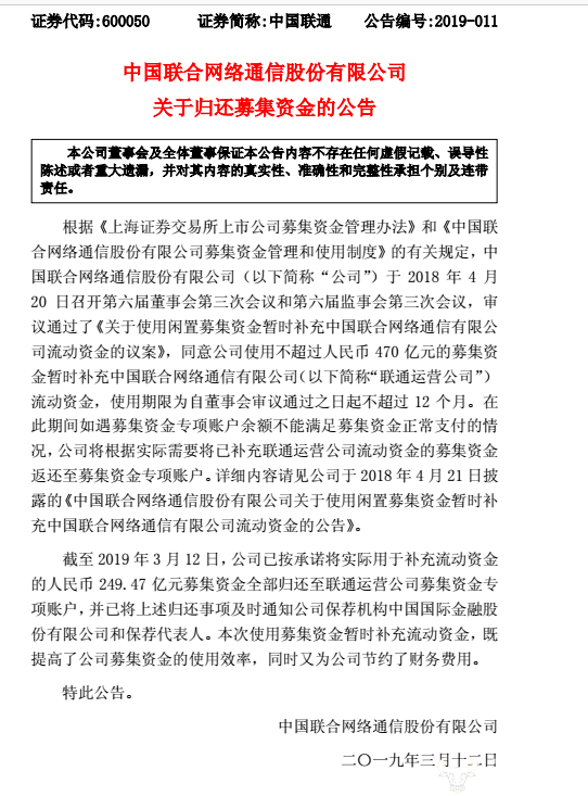 2019年3月12日,中国联合网络通信有限公司(以下简称“联通运营公司”)发布关于归还募集资金的公告。