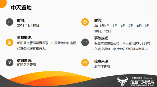 3月14日,运营商财经网举行了2019财经TMT行业315质量报告发布会,会上发布了多行业领域报告,其中盘点了2018年被通报批评中介榜单,中天置地名列其中。