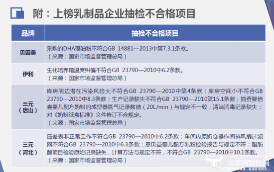 据国家市场监督管理总局通报显示,三元集团T唐山分部和河北分部因多项违规被通报。具体说来,唐山分部涉及的问题主要有库房周边潜在污染风险大、库房空间小、生产记录缺失、抽查婴倍喜婴儿配方奶粉的成型器氮气记录数值(20L/min)与规定不一致、清洁消毒记录缺失、对《奶粉纸盒标准》文件修订不合规定等。河北分部的问题主要是,压差表非正常工作、车间内原奶仓操作间排风扇过滤网不符合相关规定条款、恩贝益婴儿配方乳粉检验报告与规定不符、脂肪酸项目检验原始记录缺失,计算方法与规定不符。
