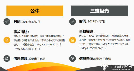 2017年4月7日,经成都市工商局通报,商标为“BULL”的两款LED灯“电源端骚扰电压”不合格(标称生产企业为“宁波公牛光电科技有限公司”,规格分别为“MQ-A103(3W E27)”和“MQ-A103(3W E14)”)。