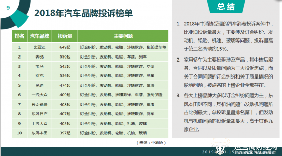 另外,在2018年中消协受理的汽车消费投诉案件中,比亚迪投诉量最大,主要涉及订金纠纷、发动机、轮胎、机油、玻璃等问题,投诉量高于第二名奔驰约15%。