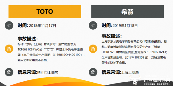 2018年11月17日,经镇江市工商局通报,标称“东陶(上海)有限公司”生产的型号为TCF6631CS#WC的“TOTO”牌温水冲洗电子坐便器(出厂批号或生产日期:316901SOH400190),输入功率和电流不合格。