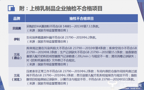据国家市场监督管理总局通报显示,三元集团T唐山分部和河北分部因多项违规被通报。具体说来,唐山分部涉及的问题主要有库房周边潜在污染风险大、库房空间小、生产记录缺失、抽查婴倍喜婴儿配方奶粉的成型器氮气记录数值(20L/min)与规定不一致、清洁消毒记录缺失、对《奶粉纸盒标准》文件修订不合规定等。河北分部的问题主要是,压差表非正常工作、车间内原奶仓操作间排风扇过滤网不符合相关规定条款、恩贝益婴儿配方乳粉检验报告与规定不符、脂肪酸项目检验原始记录缺失,计算方法与规定不符。