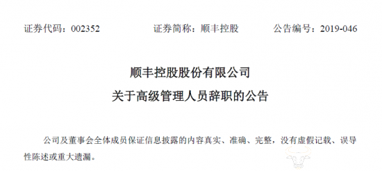 2019年3月16日,顺丰控股股份有限公司(以下简称“顺丰控股”)发布关于高级管理人员辞职的公告。