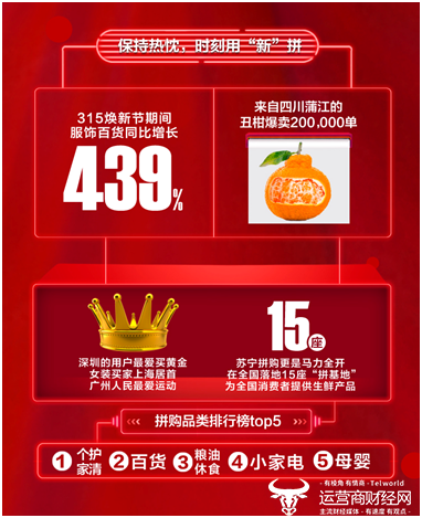 315全民焕新节期间,苏宁拼购在全国落地15座“拼基地”,为消费者提供生鲜产品。截至3月15日18点,来自四川蒲江的丑柑成为爆款,共计售出超20万单,湖北荆州大米售出12多万单。今年3月底,苏宁拼购将再新增5座“拼基地”,补强生鲜供应链。