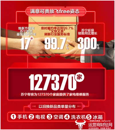 焕新节期间,苏宁易购物流订单最快17分钟完成送达;准时履约率达到99.7%,“又快又准”刷新行业服务标准;大家电送装一体服务,扩展至全国148个城市。
