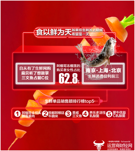 截至3月15日18时,苏宁生鲜品类最受欢迎的TOP 3产品,分别为阿榴哥冻榴莲、恒都牛腩块、美威三文鱼。南京、上海、北京最爱买生鲜产品。购买阿榴哥冻榴莲的消费者中,62.8%为女性。