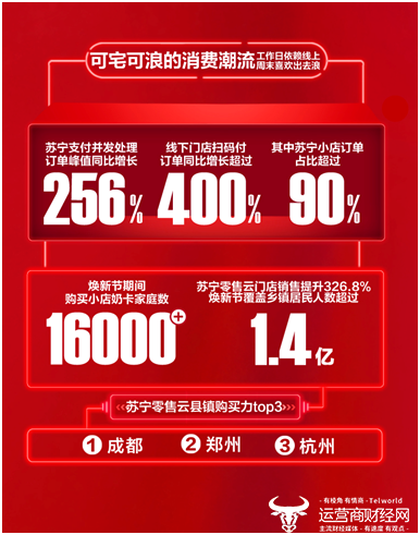 焕新节期间,任性贷新增用信交易环比增长109%;苏宁支付并发处理订单峰值同比增长256%,线下门店扫码付订单同比增长超过400%,其中苏宁小店订单占比超过90%;苏宁延保销售同比增长300%。