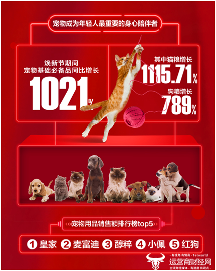 315全民焕新节,铲屎官们也没忘记家里的“主子”。数据显示,截至3月15日18点,宠物基础必备品同比增长1021%。其中猫粮增长1115.71%,狗粮增长789%,皇家、顽皮成铲屎官最爱的宠粮品牌。