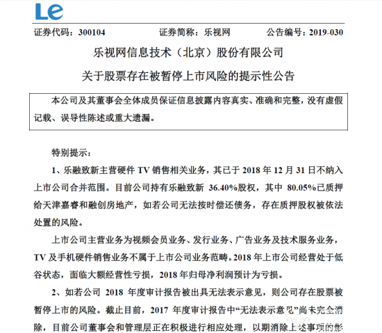 关于股票存在被暂停上市风险的提示性公告》披露,其2018全年净资产为负,乐视有被暂停上市的风险。