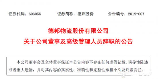 2019年3月19日,德邦物流股份有限公司(以下简称“德邦物流”)发布关于公司董事及高级管理人员辞职的公告。