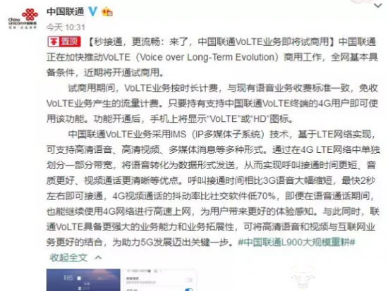 3月19日上午中国联通官方宣布,中国联通VoLTE业务即将试商用。