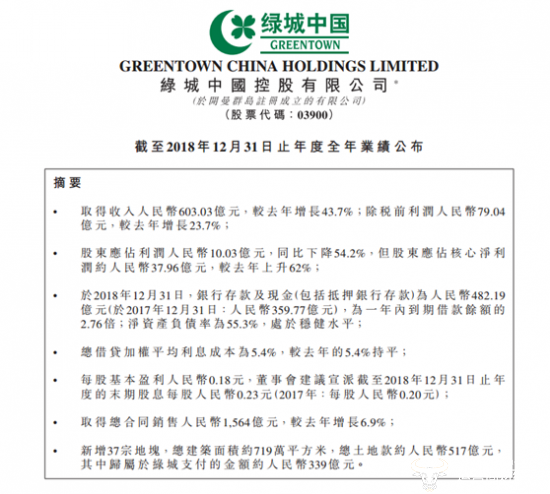 今日,绿城中国发布截至2018年12月31日止年度业绩公告。