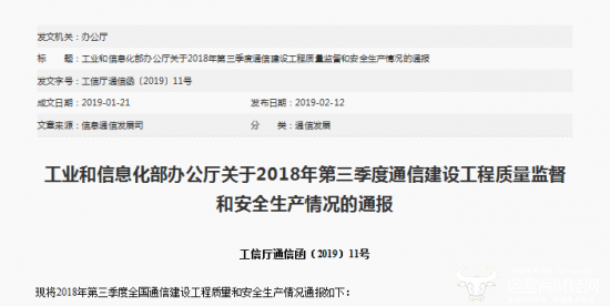 当前,工信部发布关于2018年第三季度通信建设工程质量监督和安全生产情况的通报。