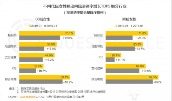 报告显示,女性人群购物欲望强烈,且自我提升及孩子教育需求高涨,在综合电商、K12 行业渗透率有明显提升。