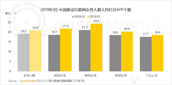 截至2019年1月,女性用户人均打开APP个数达21个,高于移动互联网的平均水平。根据此前相关数据报告,移动互联网人均APP打开个数为19个。