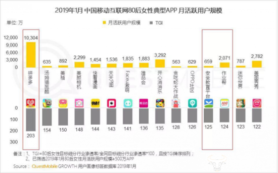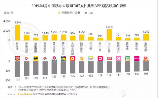 QuestMobile报告对此解释称,“70后女性已过不惑之年,有一定的财富积累,且时间充裕”,80 后女性则“承担着女人、妻子、母亲的多重角色”,“同时也是家庭购物决策的主导者”,拼多多的社交拼团模式“带动她们的日常生活用品的采购需求”。