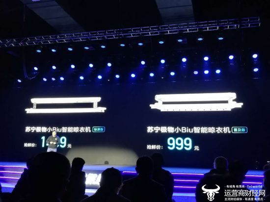苏宁极物小Biu智能晾衣机,可实现全效立体烘干、光波杀菌科技、小Biu音响操控、APP远程控制等功能。常江表示,这款晾衣机非常坚固耐用,拥有40KG超强承重、菱形衣杆、德系超静音电机、纳米喷漆工艺、遇阻保护等功能,售价上,标准版1499元,普及版本999元。