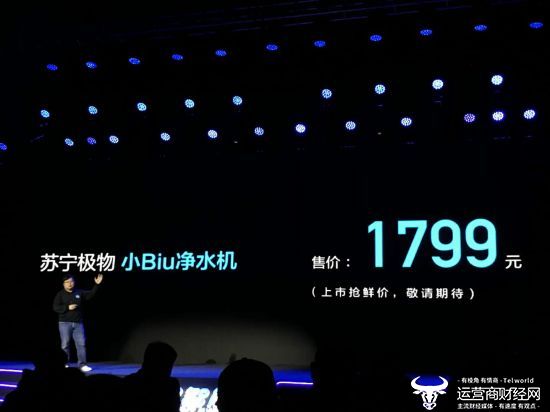 苏宁极物小Biu净水机,拥有500加仑大通量,没有储水罐,避免了水质的二次污染,一分钟能出水1.3升,采用RO反渗透过滤技术,过滤精度可以达到0.001微米,脱盐率可达到99%以上,纯废水比可达到1:1,可自动检测水量水质,状态查询提醒等,售价1799元。