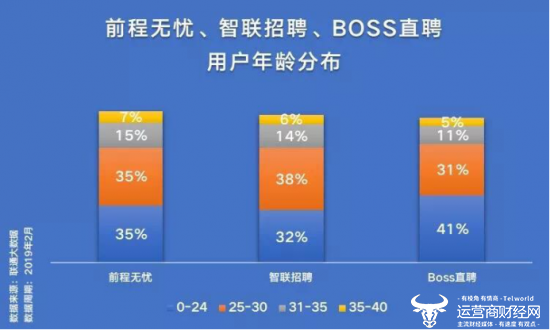 从用户年龄分布情况看,BOSS直聘的用户中0-24岁人群比例高达41%,显然“找工作,我要跟老板谈”的slogan精准匹配了个性张扬的95后;智联招聘的用户在25-30岁年龄段数量最多,占比达38%。