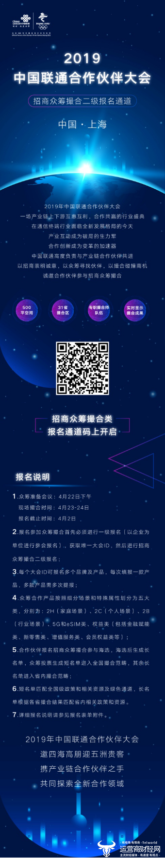 2019年中国联通合作伙伴大会的筹备工作正在如火如荼地推进中,陆续开启的各分类报名通道更是不断撩拨着全国合作伙伴的心弦。值得一提的是,在二级报名——招商众筹撮合报名通道开启的第一天,合作伙伴踊跃响应,网站一度拥挤到几近瘫痪,可见其火爆程度之高。