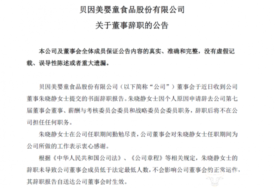 近日,贝因美发布了最新公告,恒天然中国区总裁朱晓静因个人原因已申请辞去公司第七届董事会、薪酬与考核委员和战略委员会委员职务,辞职后将不再贝因美担任任何职务。