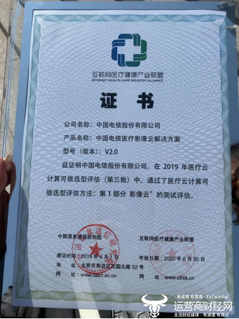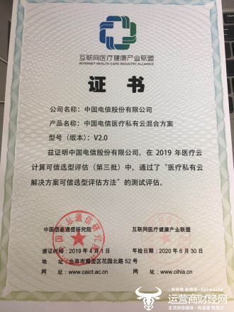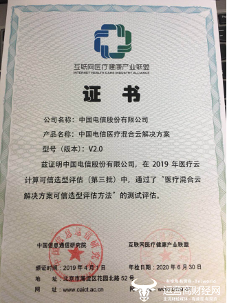 2019年4月1日,中国信息通信研究院和互联网医疗健康产业联盟联合发布了医疗云计算可信选型评估(第三批)结果。中国电信医疗混合云解决方案、医疗私有云解决方案、医疗影像云解决方案,从众多医疗云服务商中脱颖而出,最终以优异成绩成功通过测评。中国电信成为全国唯一一家同时荣获“医疗混合云”、“医疗私有云”、“医疗影像云”可信选型认证的电信运营商。2018年12月,中国电信荣获远程医疗信息系统基础设施、业务功能两项可信评测认证,本次再获三项可信评测认证,进一步印证了中国电信在医疗信息化领域的专业能力。