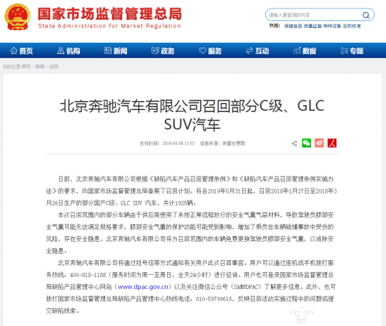 据市场监管总局官网消息,日前,北京奔驰汽车有限公司根据相关文件要求,向国家市场监督管理总局备案了召回计划。将自2019年5月31日起,召回2018年1月27日至2018年3月26日生产的部分国产C级、GLC SUV 汽车,共计1925辆。