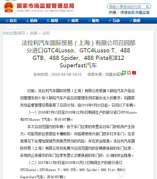 据市场监管总局官网消息,日前,由于车辆存在安全隐患,法拉利汽车国际贸易(上海)有限公司根据《缺陷汽车产品召回管理条例》和《缺陷汽车产品召回管理条例实施办法》的要求,向国家市场监督管理总局备案了召回计划,自2019年5月22日起,召回相关问题车辆。