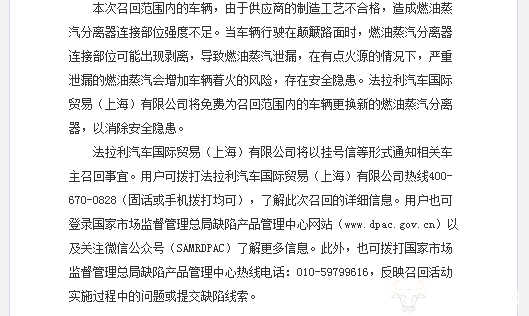 法拉利汽车国际贸易(上海)有限公司将免费为召回范围内的车辆更换新的燃油蒸汽分离器,以消除安全隐患。
