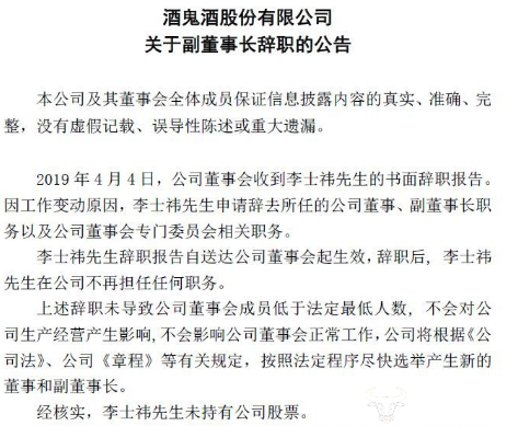 近日,酒鬼酒宣布宣布重大人事变动,李士祎申请辞去所任的公司董事、副董事长职务以及公司董事会专门委员会相关职务。