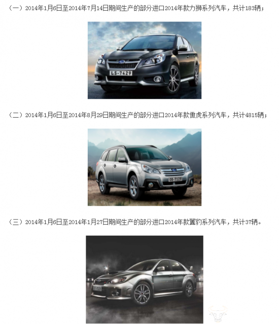 4月8日,国家市场监督管理总局缺陷产品管理中心发布公告称,斯巴鲁汽车(中国)有限公司根据《缺陷汽车产品召回管理条例》和《缺陷汽车产品召回管理条例实施办法》的要求,将自2019年5月17日起,扩大召回部分进口力狮、傲虎、翼豹系列汽车,共计5035辆。